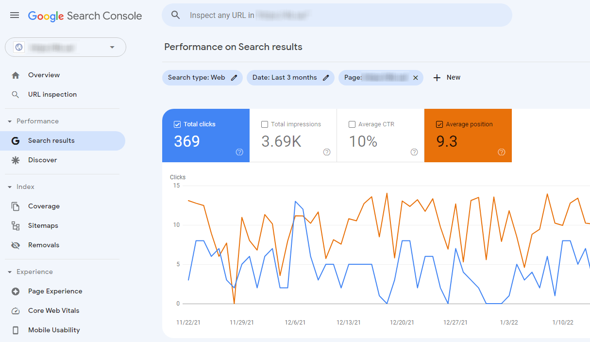 Oto przykład raportu dla jednej ze stron witryny, gdzie średnia pozycja w wynikach wyszukiwania w ciągu ostatnich 3 miesięcy wynosi 9,3, co jest ogólnie dobrym wynikiem.